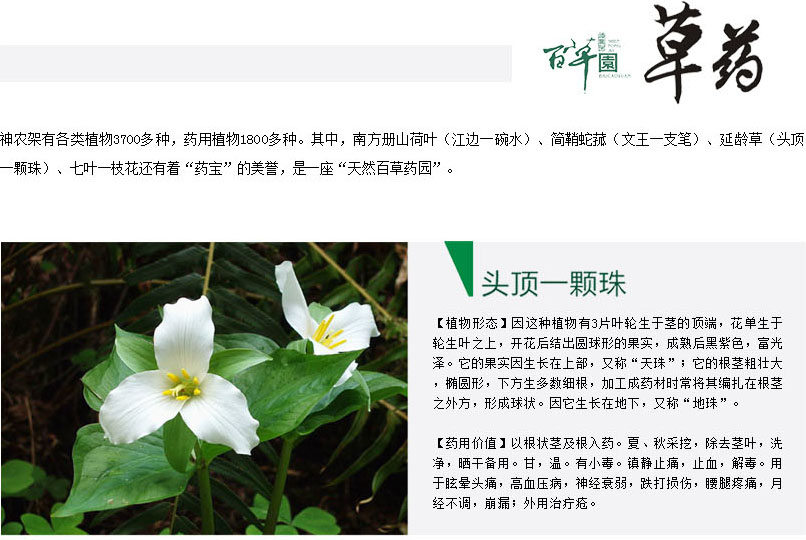 神农架有各类植物3700多种,药用植物1800多种。其中,南方册山荷叶(江边一碗水)、简鞘蛇菰(文王一支笔)、延龄草(头顶一颗珠)、七叶一枝花还有着“药宝”的美誉,是一座“天然百草药园”。