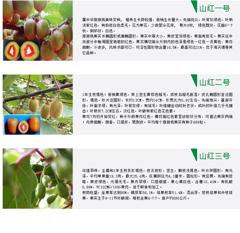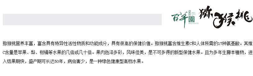 猕猴桃营养丰富,富含具有特异性活性物质和功能成分,具有很高的保健价值。猕猴桃富含维生素C和人体所需的17种氨基酸。其维C含量是苹果、梨、柑橘等水果的几倍或几十倍。果肉色泽多彩,风味佳美,是不可多得的新型保健水果。且为多年生藤本植物,进入结果期快,盛产期可长达50年,病虫害少,是一种绿色健康型高档水果。